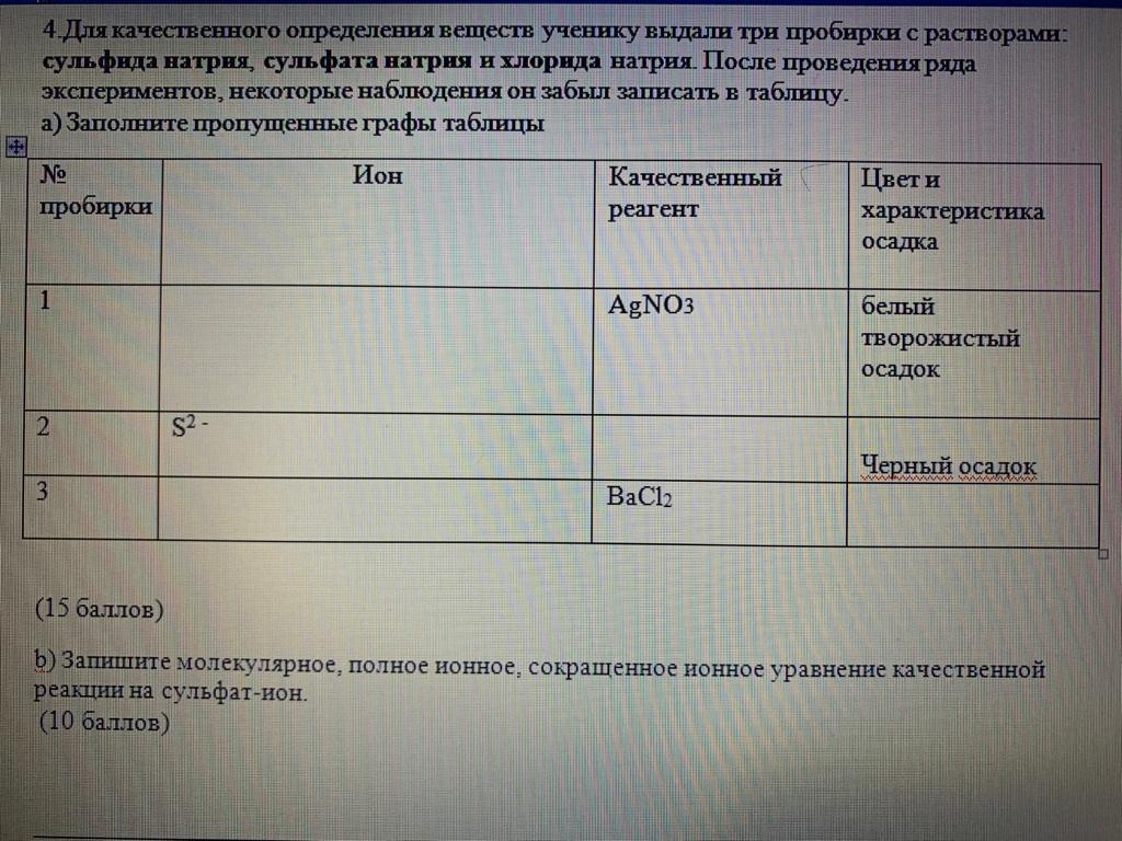 3 пробирка: ион SO4 2-, осадок белый мелкокристаллический нерастворим в кислотах