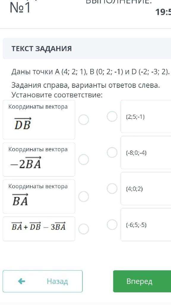 Даны точки (4; 2; 1), В (0; 2; -1) и D (-2; -3; 2). Задания справа, варианты ответов слева. Установите соответствие: Координаты вектора DB (2:5:-1) Координаты вектора (-8;0;-4) -2BA Координаты вектора (4;0;2) (-6;5; 5) Назад Вперед