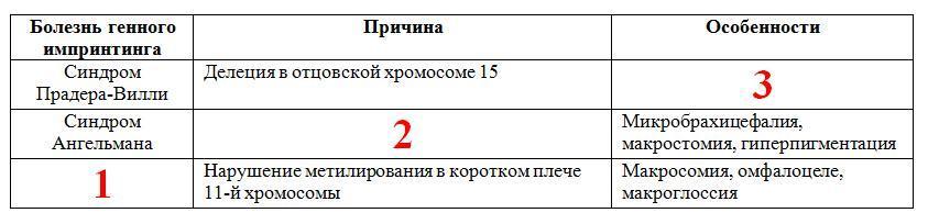 2) Обычно синдром вызывается спонтанным хромосомным дефектом, когда отсутствует большая смежная область из 3–4 миллионов пар оснований ДНК на участке q11–q13 15-й хромосомы. Согласно результатам многих независимых исследований, причиной возникновения синдрома Ангельмана может являться мутация в гене UBE3A.