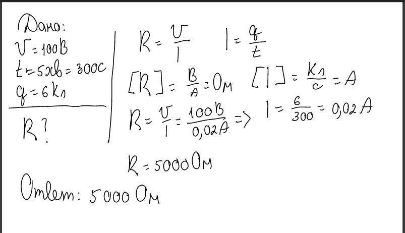 Чому дорівнює опір провідника який перебуває під напругою 100 В, якщо за 5 хв через поперечний переріз пройшов заряд 6 Кл