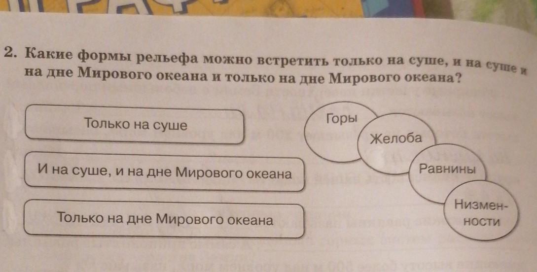 Только на суше: горы,низменности,равнины. Только на дне океана: желоба.