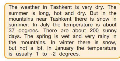 погода в Ташкенте очень сухая. лето долгое, жаркое и засушливое. Но в горах под Ташкентом лежит снег. в июле температура около 37градусов. здесь обычно 200 солнечных дней. весна в горах очень дождливая и влажная. зимой бывает снег, но не много. обычно температура в январе 1-2 градуса.