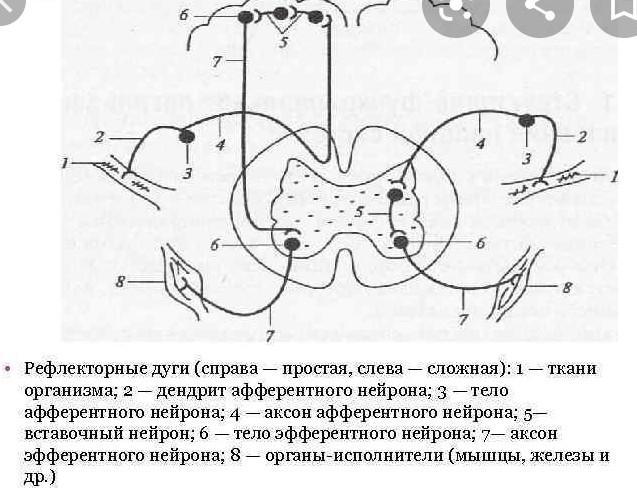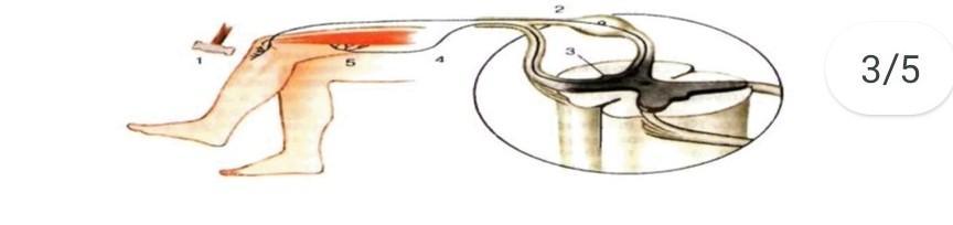 1 рецептор —> 2 чувствительный дендрит, или дендрит афферентного нейрона—> 3 тело двигательного нейрона —> 4 двигательный аксон, или аксон эфферентного нейрона —> 5 эффектор (мышцы, железы и пр.)