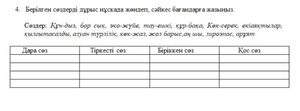 Берілген сөздерді дұрыс нұсқада жөндеп, сәйкес бағандарға жазыңыз.