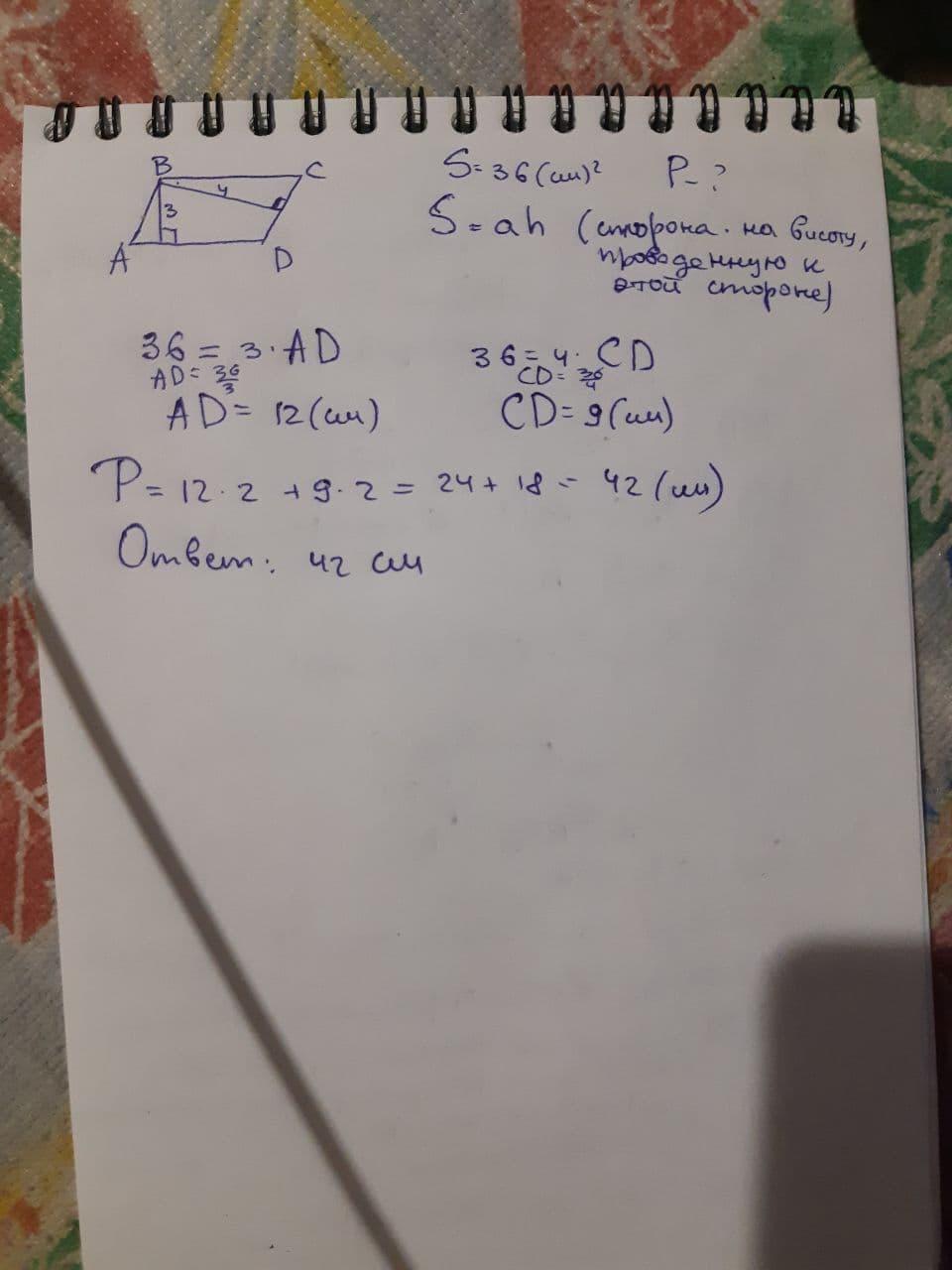 14. Площадь параллелограмма равна 36 cm?, высоты 3 cm и 4 cm.