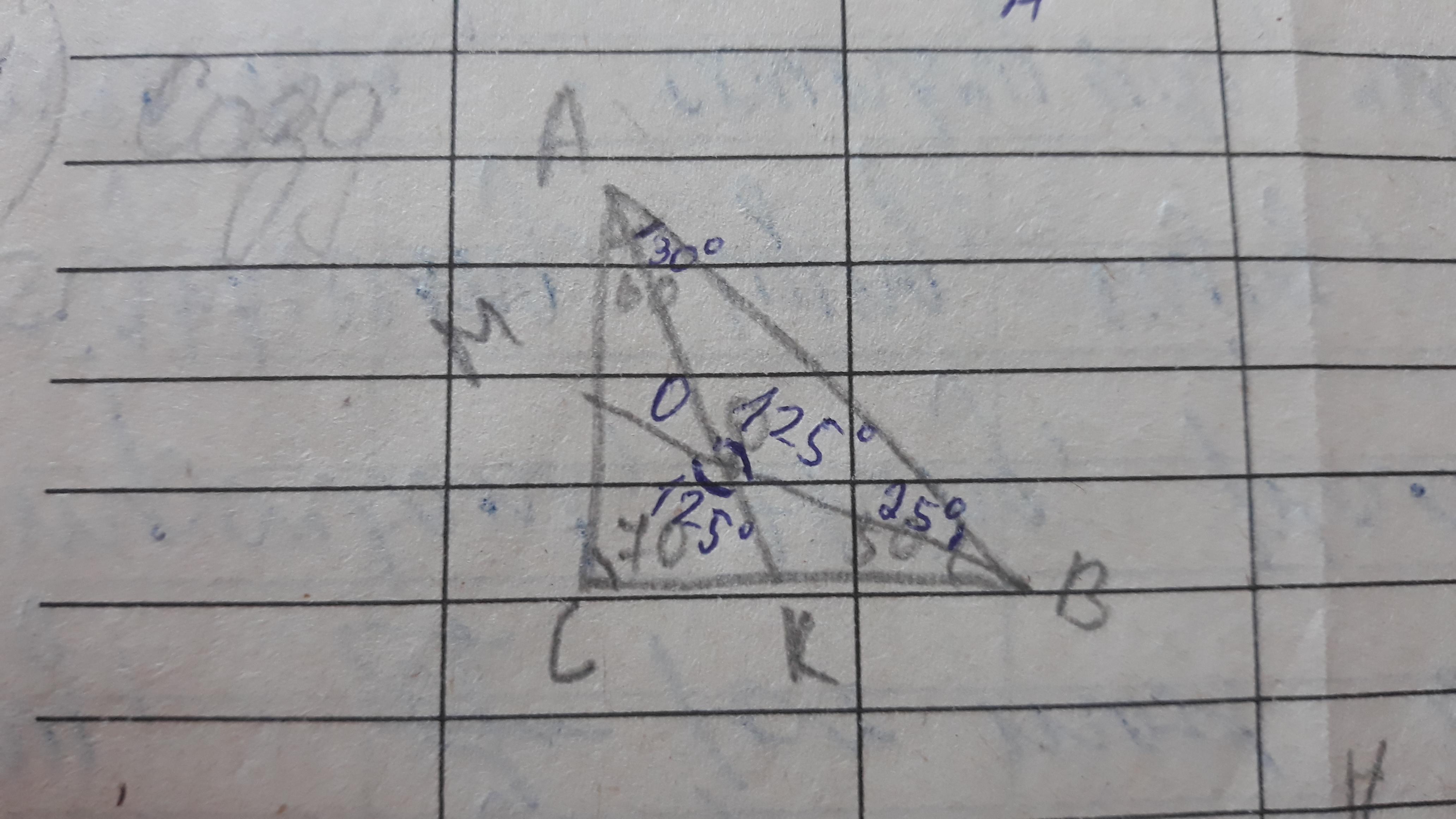 в треугольнике ABC угол B=50°, уголC=70° Биссектрисы AK и BM треугольника ABC пересекаются в точке O. найдите угол KOM