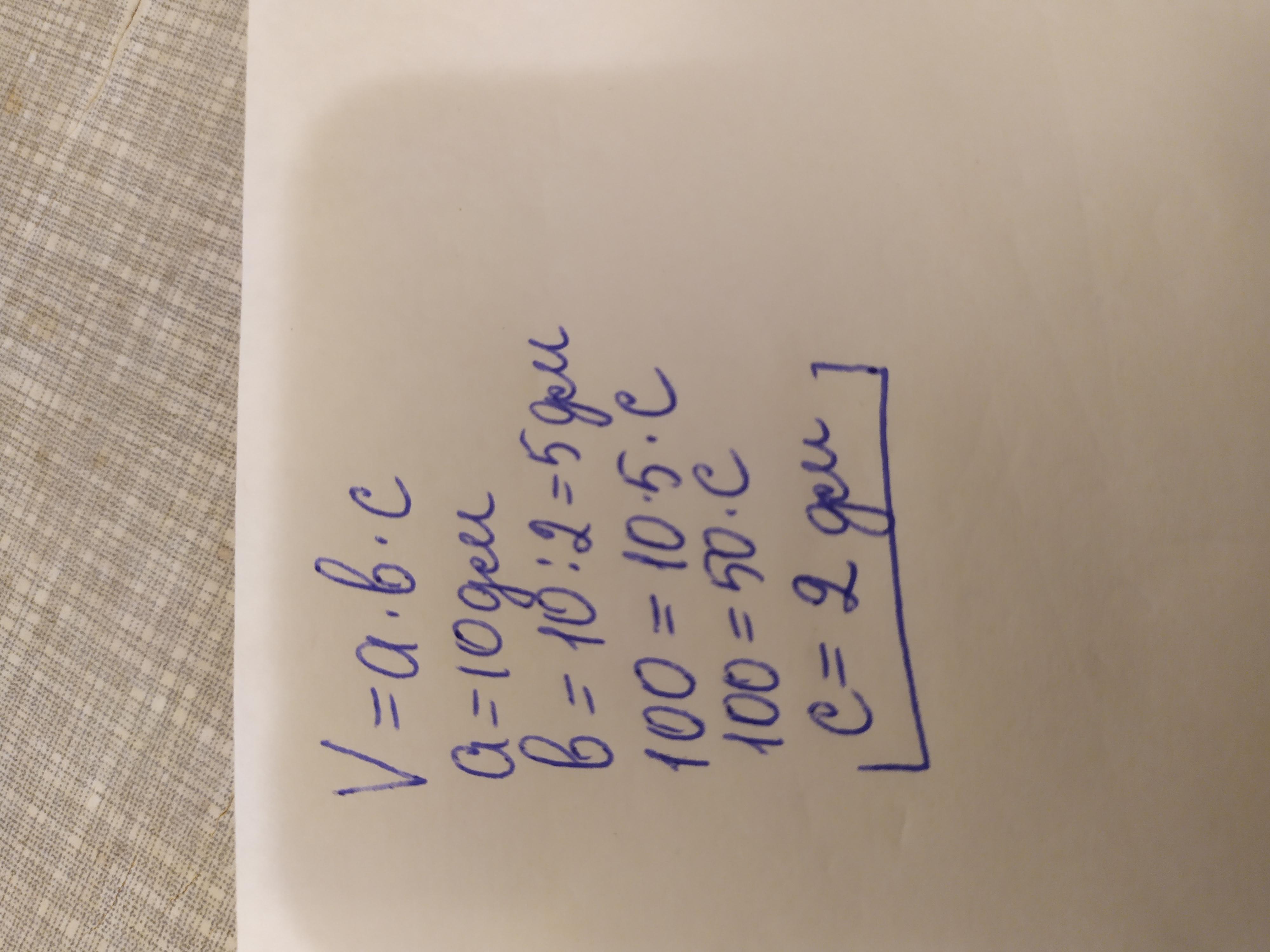 Ответ: обозначим высоту как h, тогда 100=10*10*0,5*h⇒100=50*h⇒h=2 дм.