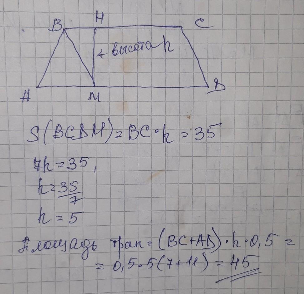 В трапеции АВСDс основаниями АD=11 см и ВС=7 см проведен отрезок ВМ(М э AD), параллельный стороне СD.Площадь параллелограмма ВCDM равна 35 см?. Найдите площадь трапеции.