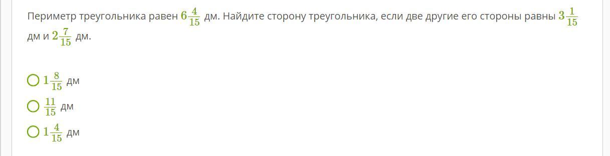 Периметр треугольника равен 6 4/15 дм. Найдите сторону треугольника, если две другие его стороны равны 3 1/15 дм и 2 7/15 дм.