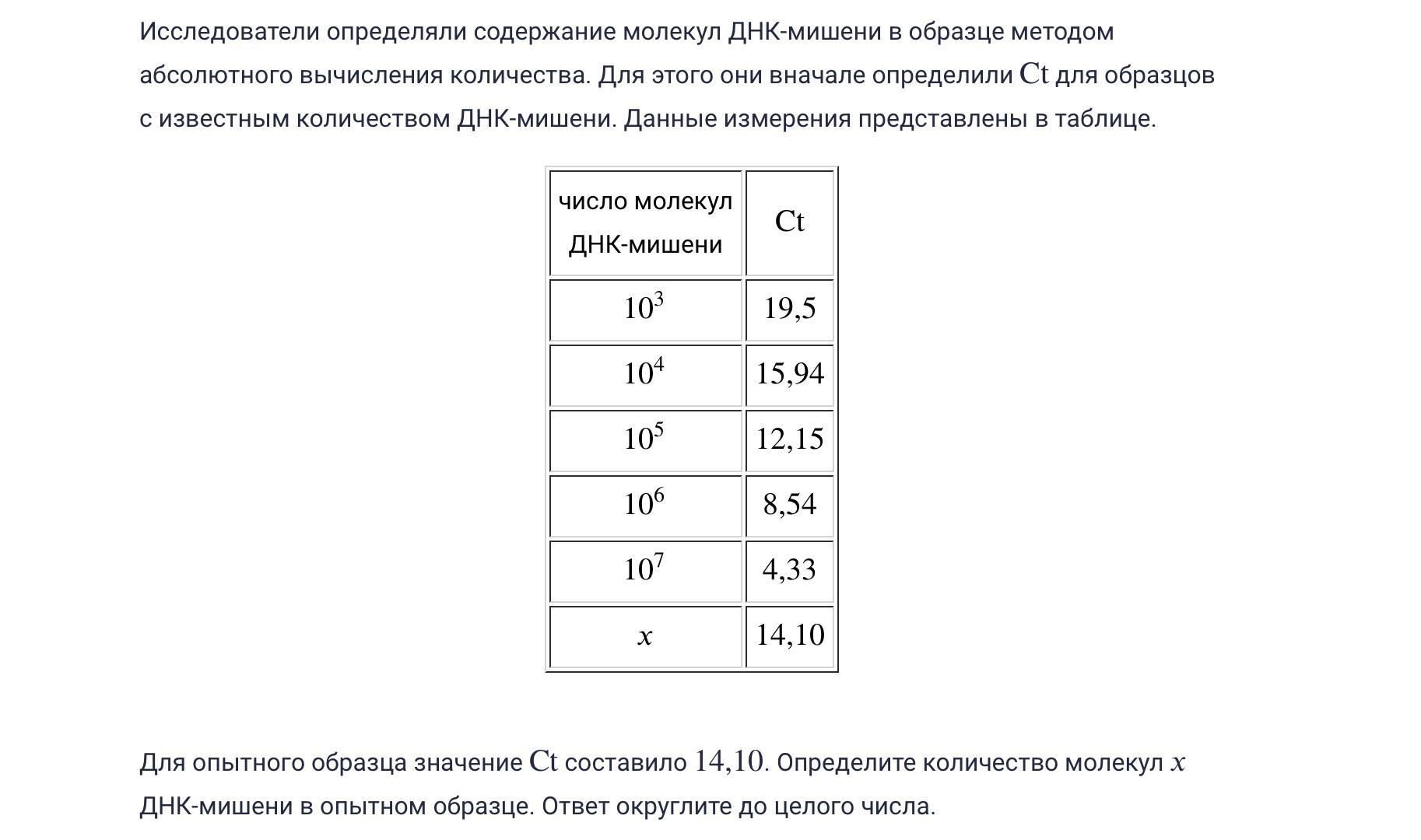 для образцов с известным количеством ДНК-мишени. Данные измерения представлены в таблице.