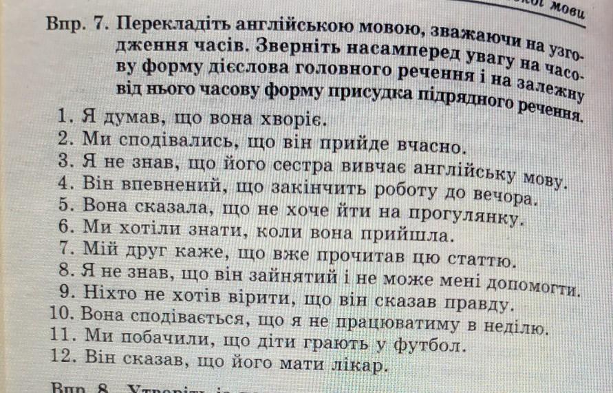 1. I thought that she was ill. 2. We hoped he would arrive on time. 3. I didn't know his sister was learning English. 4. He's sure he'll be done by evening. 5. She said she did not want to go for a walk. 6. We wanted to know when she came. 7. My friend says he has already read this article. 8. I didn't know he was busy and couldn't help me. 9. No one wanted to believe that he had told the truth. 10. She hopes I won't work on Sunday. 11. We saw children playing football. 12. Bin said his mother was a doctor.