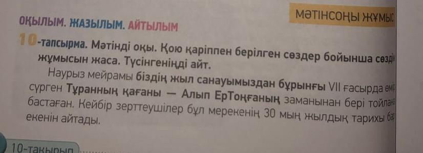Перипиши выделенные слова и перевиди их: біздің жыл санауымыздан бұрынғы -- до нашего времени;. Тұранның қаған- правитель Турана;. Алып Ер Тоңғанның -- великого Ер Тогана