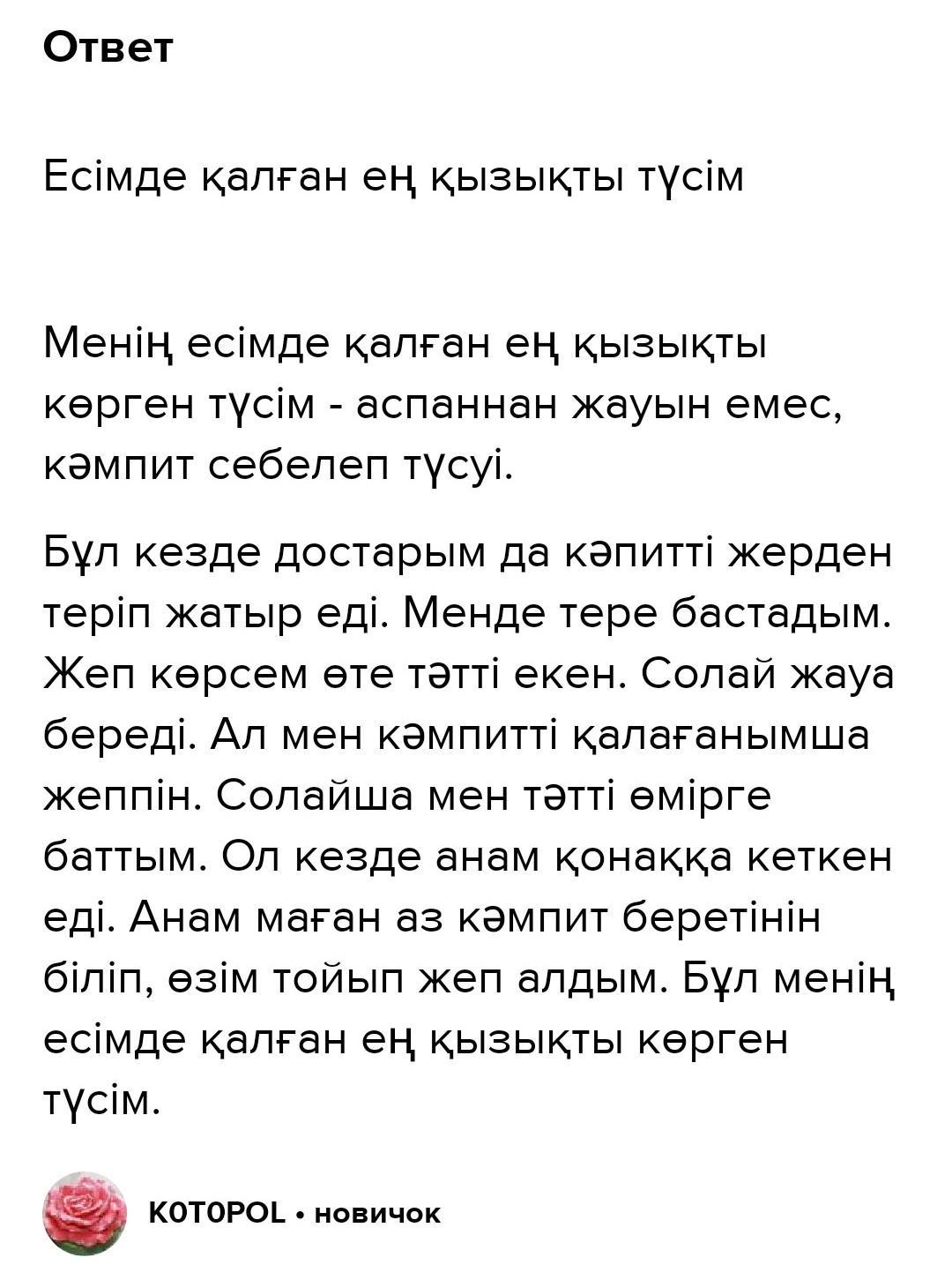 Менің ең қызықты көрген түсім - менің ауызбен айтқанымның бәрі орындалады. Керек болса ауызбен айта саламын. Сол кезде керек зат пайда болады. Бірақ мен ең бірінші өз отбасыма денсаулық пен мол бақыт берсін деп тіледім. Өйткені, отбасы ақша мен алтыннан да қымбат қазына. Мен ең соңында ғана тіледім байлықты. Ал ең бірінші өз жанұяма денсаулық пен мол бақыт тіледім. Бұл менің ең қызықты түсім.
