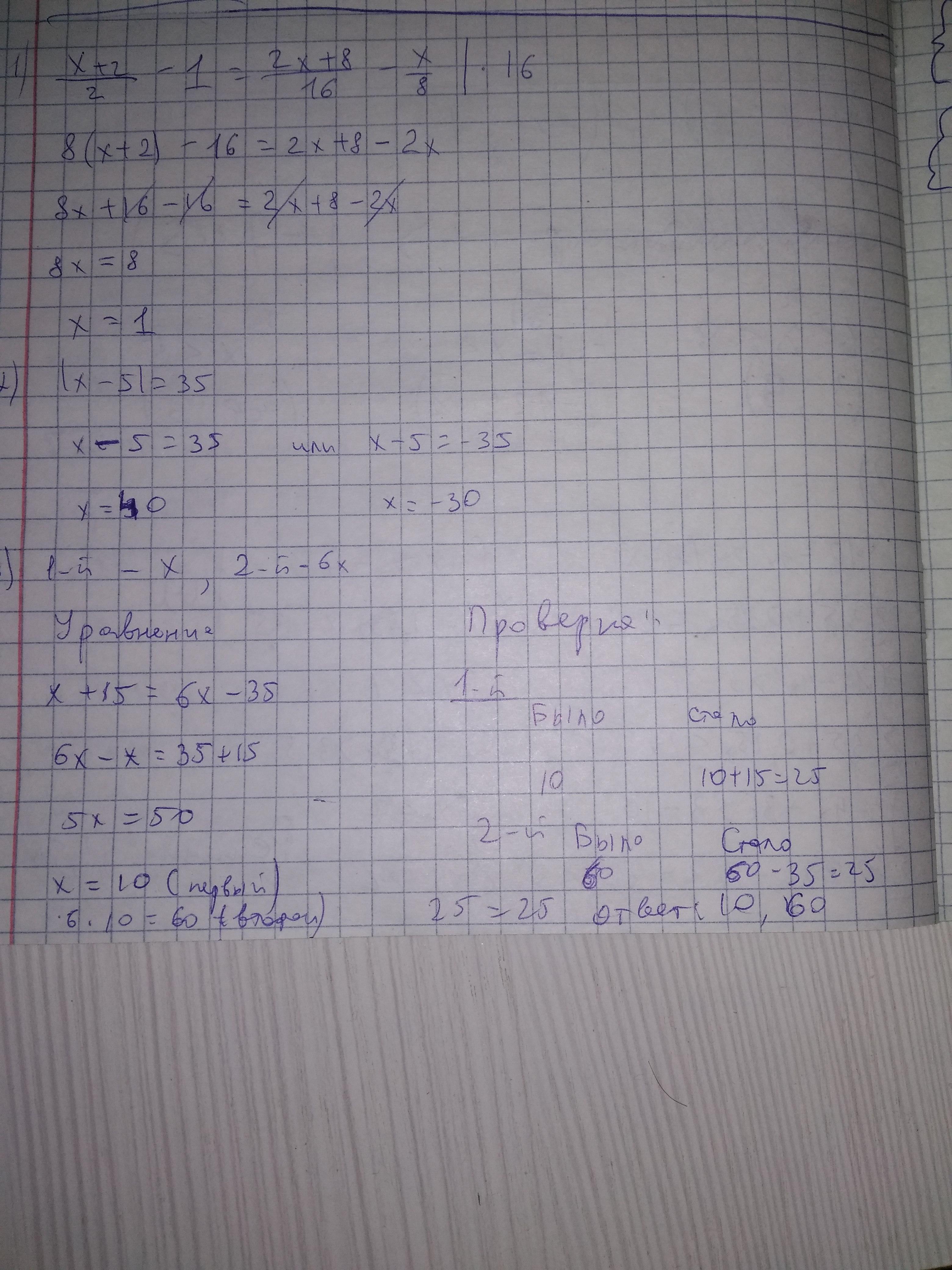 3. В одном шкафу было в 6 раза меньше книг, чем в другом. Когда в первый шкаф положили 15 книг, а из второго взяли 35, то в обоих шкафах книг стало поровну. Сколько книг было в каждом шкафу?