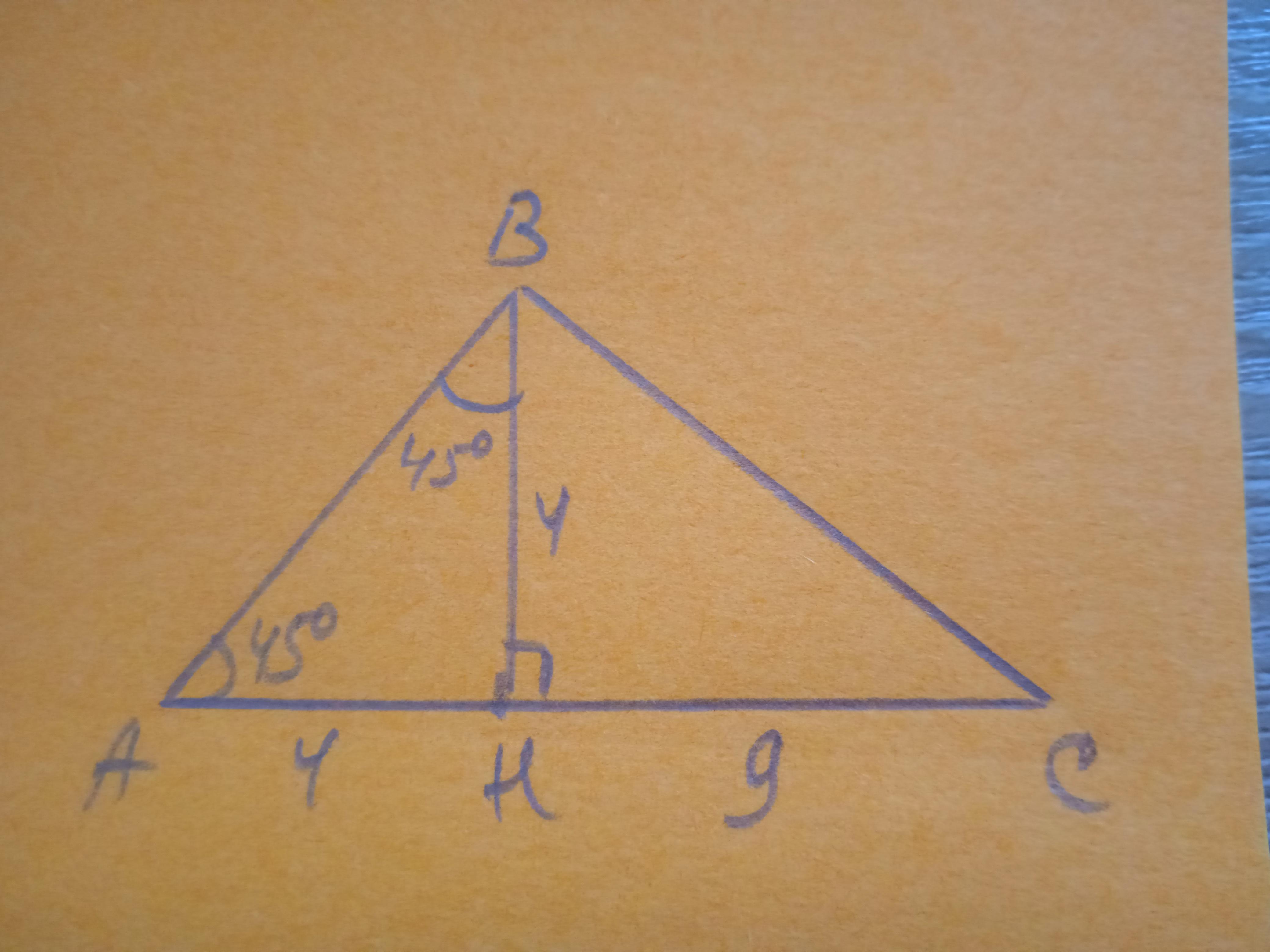 В треугольнике АВС, ∠А=45°, а высота ВН делит сторону АС на отрезки АН и НС соответственно равные 4 см и 9 см. Найдите площадь треугольника АВС.