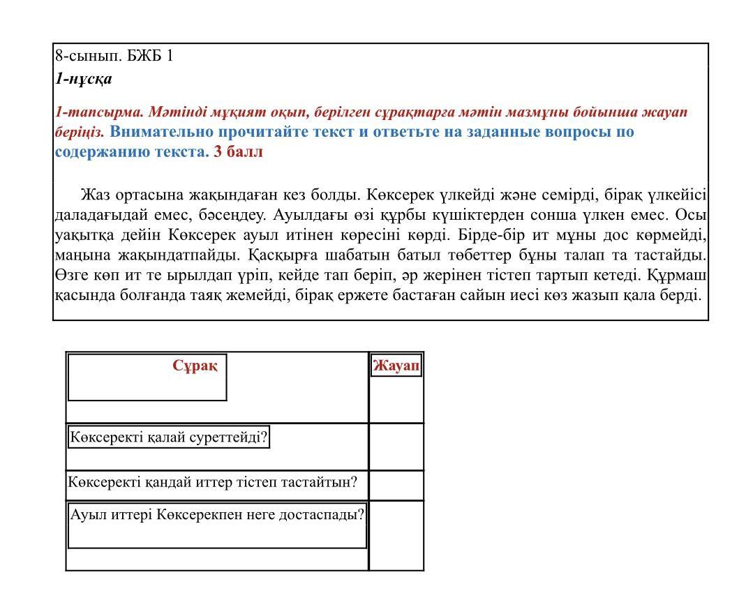 1-тапсырма. Мәтінді мұқият оқып, берілген сұрақтарға мәтін мазмұны бойынша жауап беріңіз. Внимательно прочитайте текст и ответьте на заданные вопросы по содержанию текста.