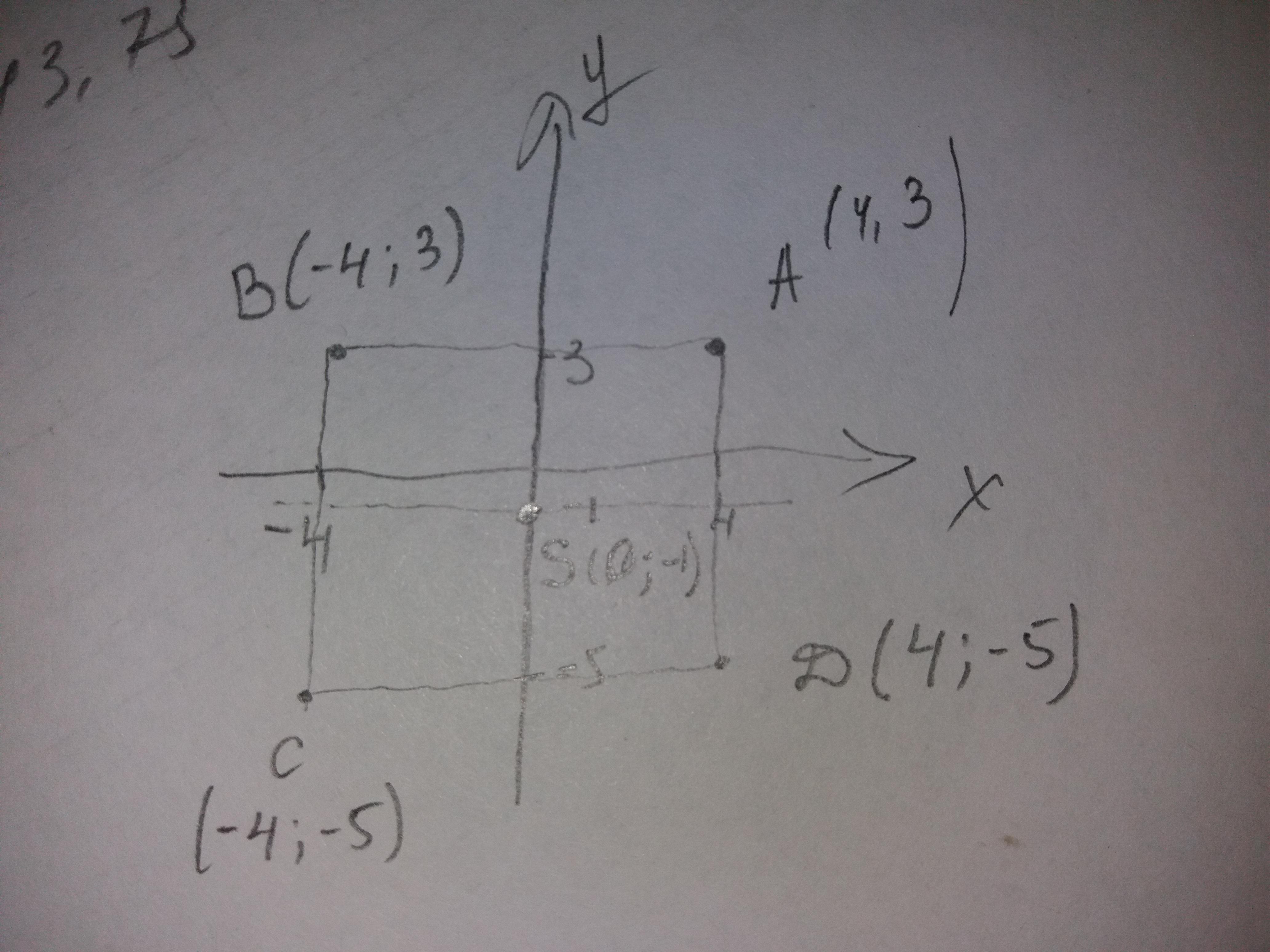 У квадрата ABCD вершина A (4; 3) симметрична вершине B, а вершина C (–4; –5) симметрична вершине D относительно оси ординат. На координатной плоскости построй квадрат ABCD и определи координаты вершин B и D, а также координаты точки S, в которой пересекаются все оси симметрии квадрата ABCD.