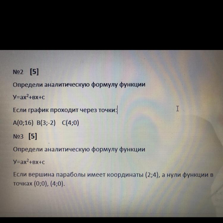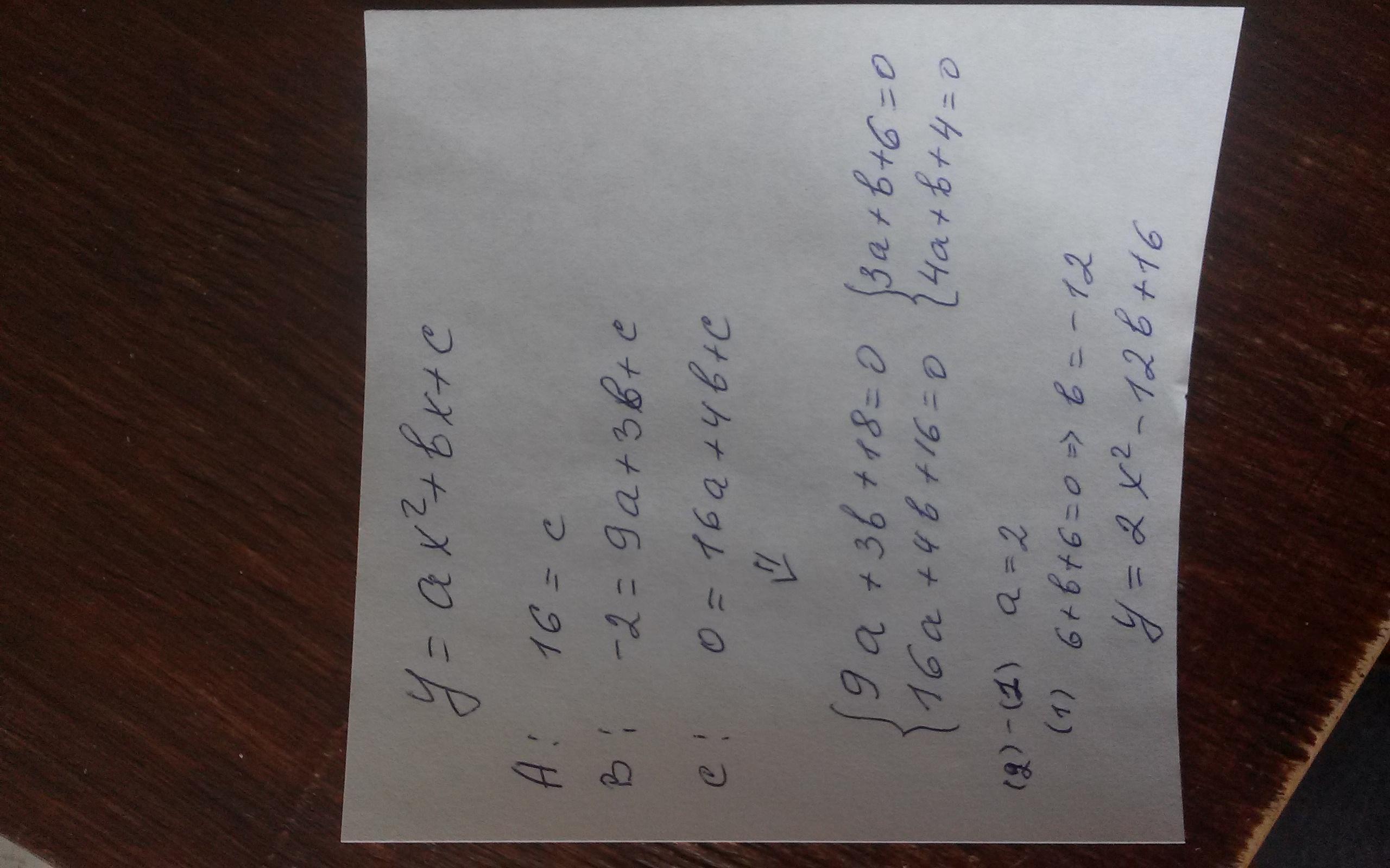 Необходимо найти значение параметров а, в и с. Доя єтого необходимо записать три уравнения, вместо х и у полставить координати точек и решить систему из єтих уравнений