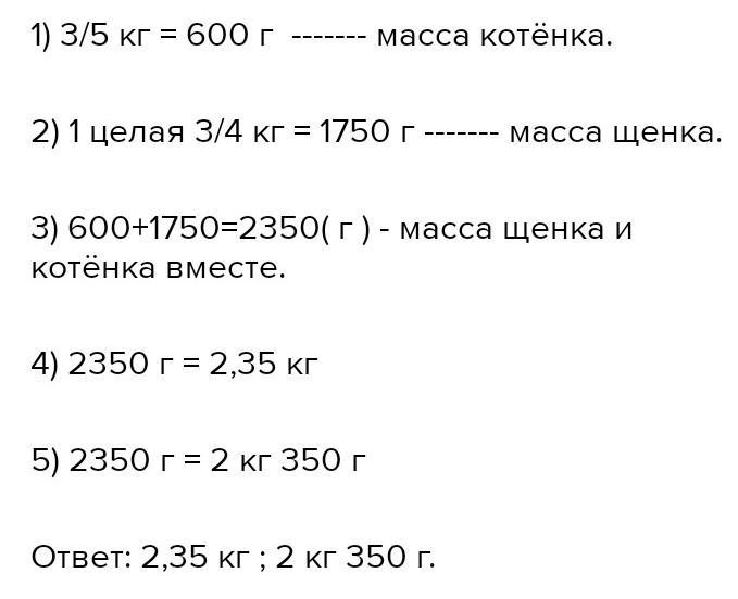 Масса котёнка 3/5 кг, а масса щенка 1 целая 3/4 кг. Какими будут показания весов, если их поместить на весы вместе? Дайте ответ сначала в килограммах, а затем в килограммах и граммах.