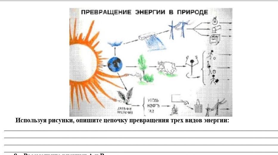 Используя рисунки, опишите цепочку превращении трех видов энергии: