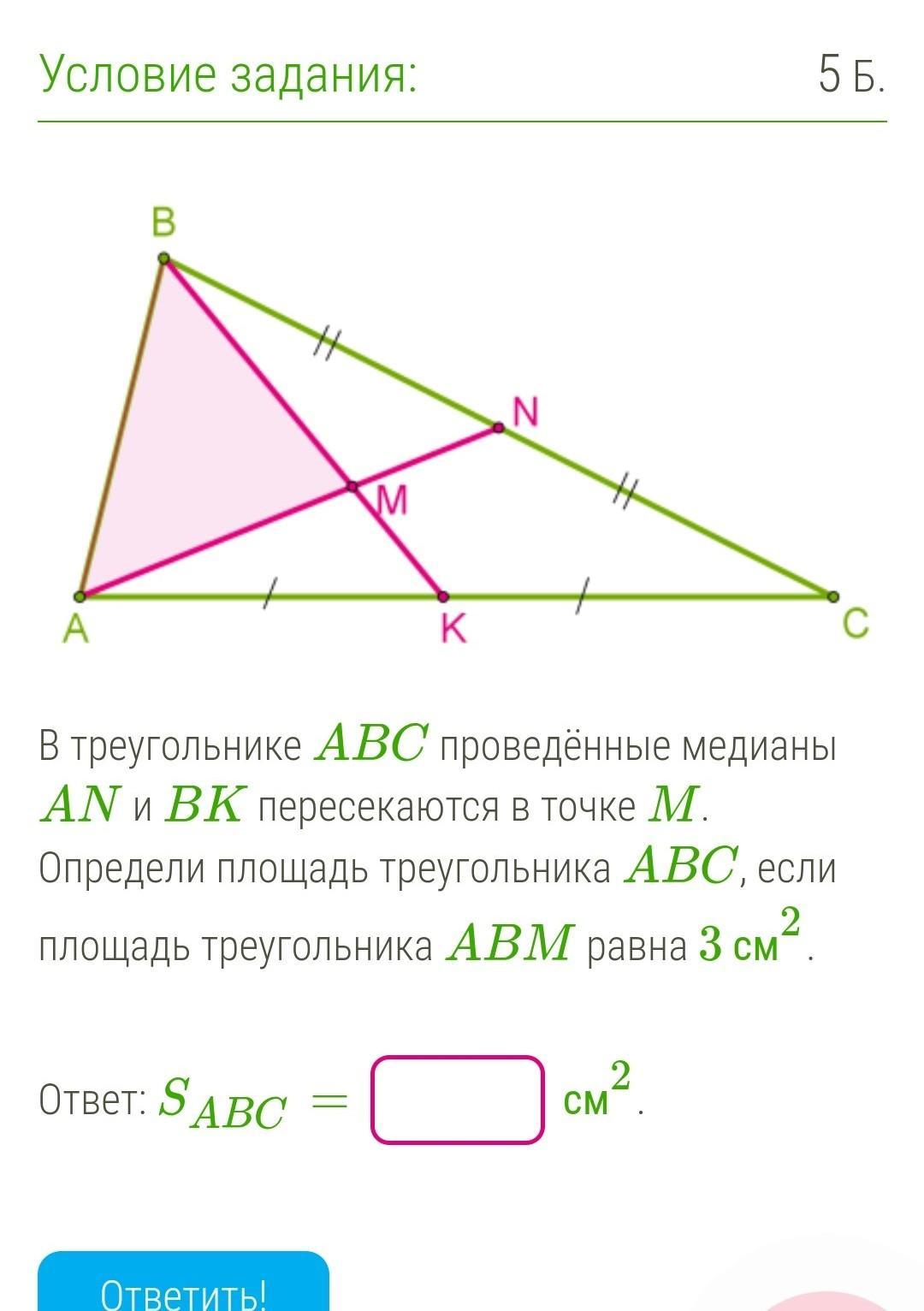 В треугольнике ABC проведённые медианы AN и BK пересекаются в точке M. Определи площадь треугольника ABC, если площадь треугольника ABM равна 3 см2.