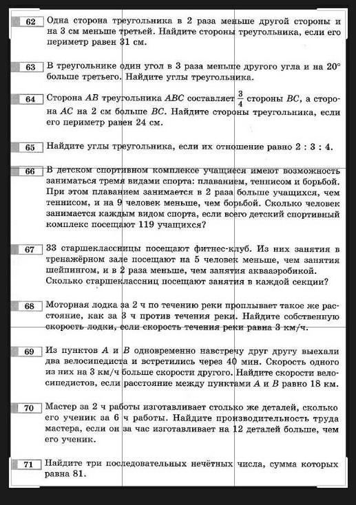 62. Пусть х- меньшая сторона треугольника, тогда 2х- вторая сторона треугольника и (х+3)- третья сторона треугольника