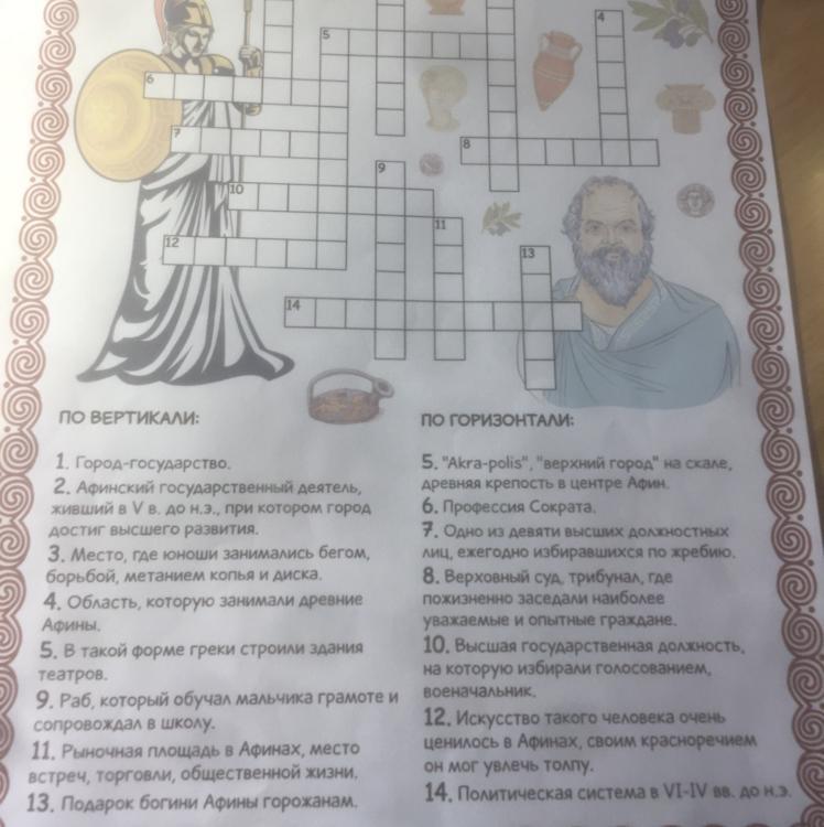 Ответ:1. Это когда страна является одним городам, и полностью независимая 2. Перикл 3. Если не ошибаюсь в специальных площадках 4.Аттика 5(по вертикали) не знаю, 5.(по горизонтали) Акрополь 6. Философ, учитель 7. Эпистат 8. Дикастерий 9. Педагог 10. Народное собрание 11. Агора 12. Незнаю 13. Водный источник, оливковое дерево 14.Олигархическая республика или афинская демократия