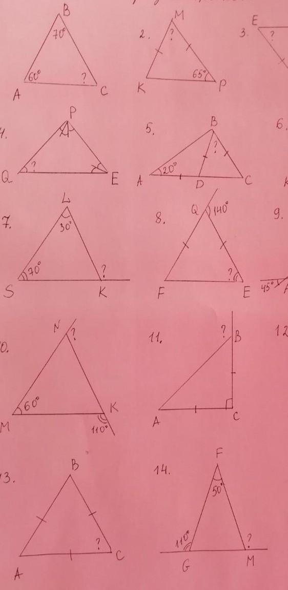 1) угол С= 180-70-60=50 ответ:50 2) угол К= углу Р(т к треугольник равнобедренный). Угол М = 180-65-65= 50 ответ =50 7) угол К внутренний= 180-30-70=80 угол К внешний = 180-80=100 ответ:100 10) угол К= 180-110=70. Угол N= 180-70-60=50. Угол N внешний= 180-50=130 ответ: 130. 11) Угол А= углу В. Угол В = (180-90):2=45. Угол В внешний= 180-45=135 ответ: 135 13) все углы треугольника в сумме дают 180а т к треугольник равносторонний то угол А = углу В= углу С. Угол С= 180:3= 60 ответ :60. 14) угол G = 180-110=70. Угол М = 180-70-50=60. Угол М внешний = 180-60= 120 ответ: 120