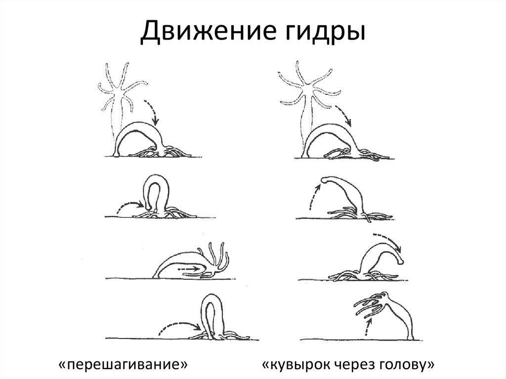 На верхнем конце гидры располагаются щупальца. Нижним концом - подошвой - она прикреплена к субстрату. Когда гидра передвигается кувырками, она наклоняется верхним концом к субстрату. Опирается на верхний конец тела и перекидывает через себя подошву. Встает на подошву, поднимает верхний конец тела и делает следующий кувырок.