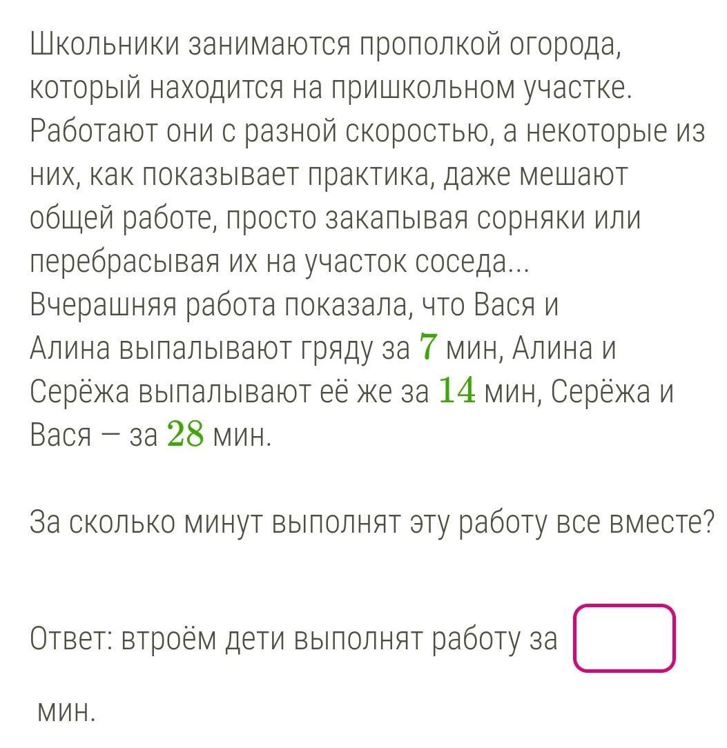1/7 + 1/14 + 1/28 = 7/28 = 1/4 = 4 часа