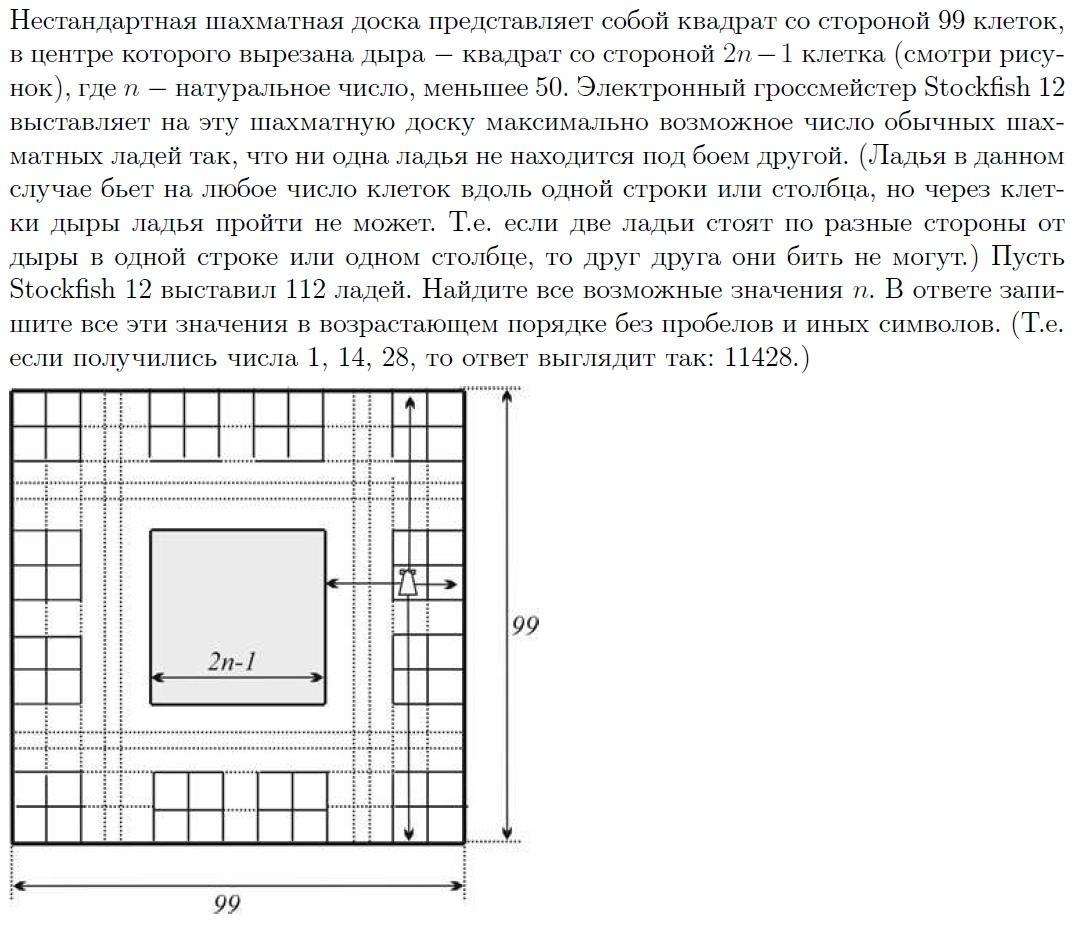 Помогите решить! Срочно! Нестандартная шахматная доска представляет собой квадрат со стороной 99 клеток, в центре которого вырезана дыра - квадрат со стороной 2n - 1 клетка, где n - натуральное число, меньшее 50.