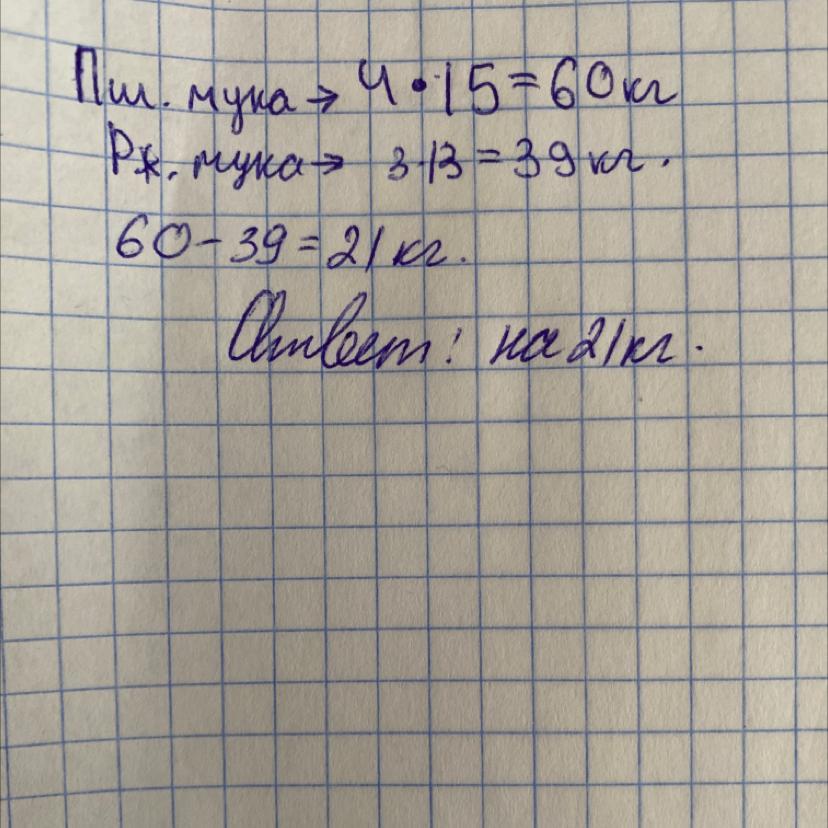 В пекарню привезли 4 мешка пшеничной муки по 15 кг в каждом и 3 мешка ржаной муки по 13 кг в каждом. На сколько кг ржаной муки меньше чем пшеничной?
