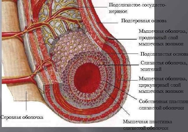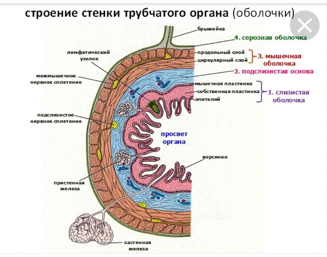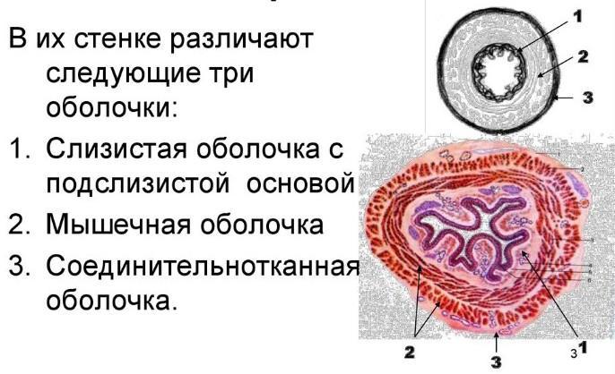 трубчатый (полый) орган состоит из слизистой оболочки, мышечного слоя, адвентиции ( соединительнотканной, серозной оболочки )