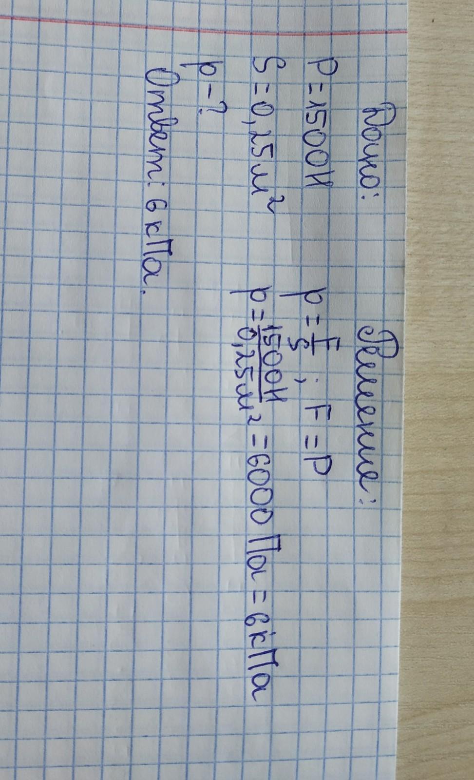 p = 1500 / 0,25 = 6000 Па = 6 кПа
