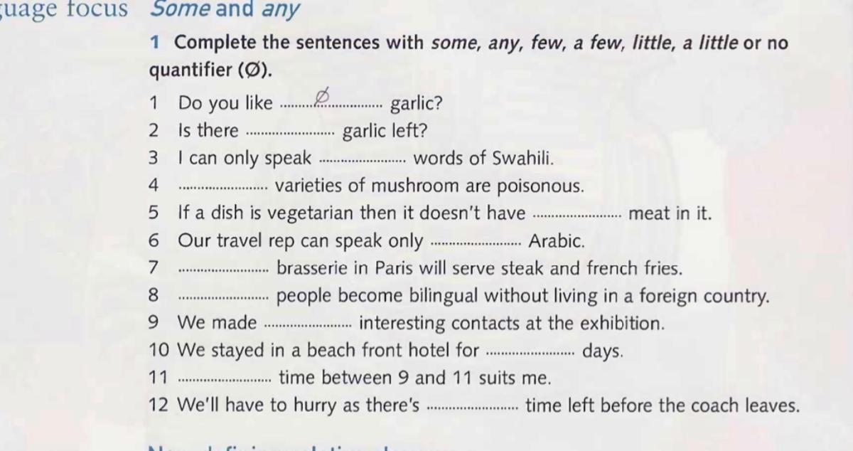 1 Complete the sentences with some, any, few, a few, little, a little or no quantifier (Ø).