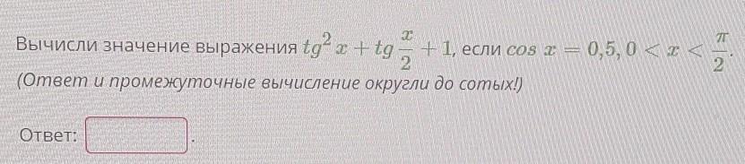 tg²x+tg(x/2)+1=3+√3/3+1=4+√3/3=(12+√3)/3≈(12+1,73)/3≈4,58