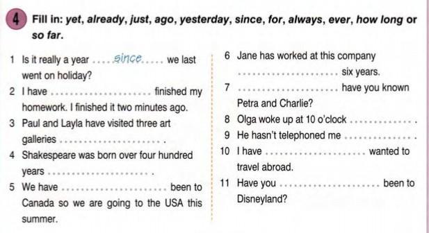 Fill in: yet, already, just, ago, yesterday, since, for, always, ever, how long or so far.