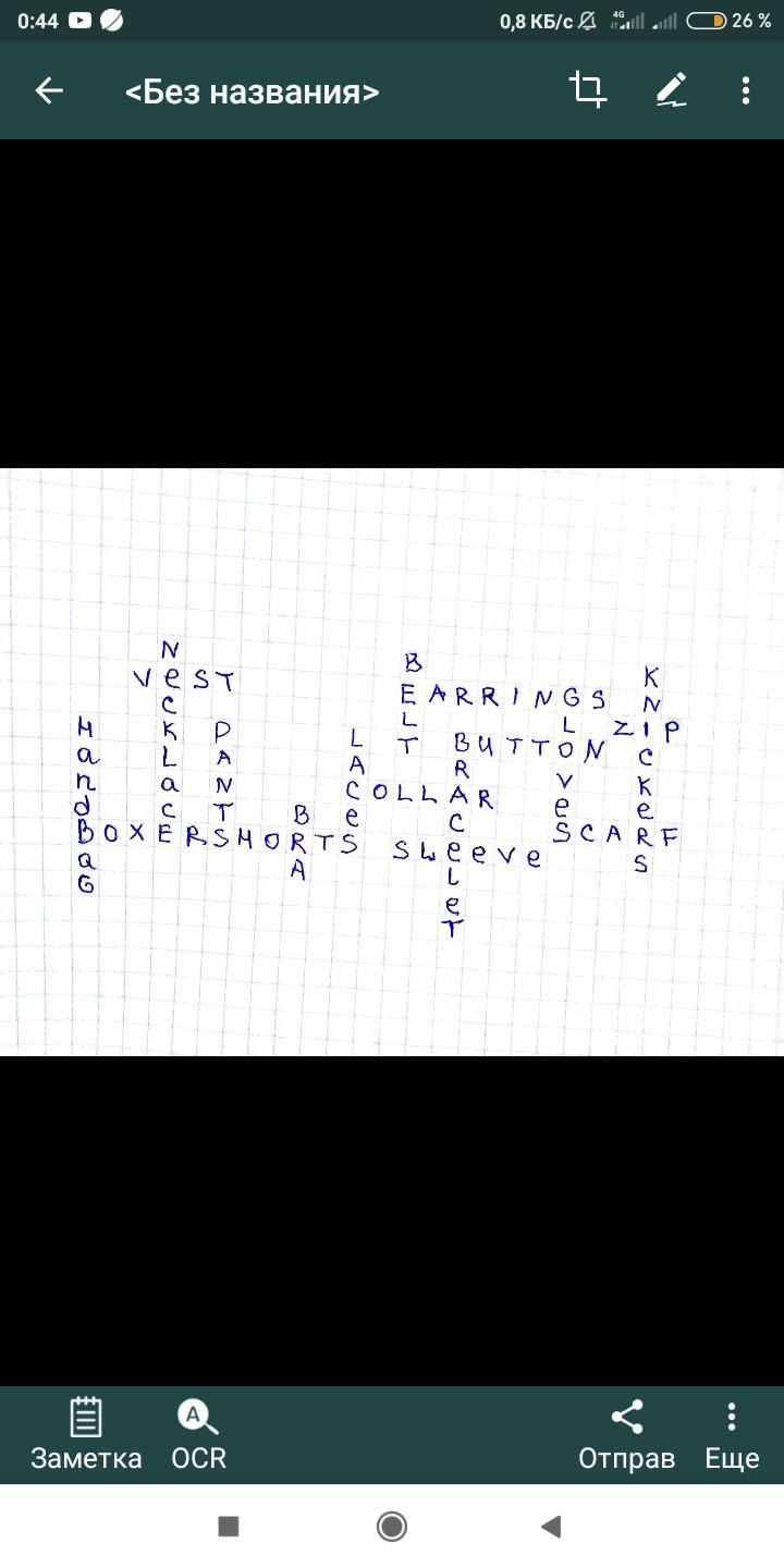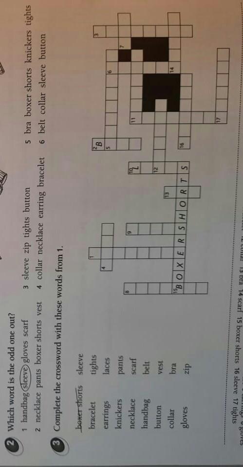 1 nechlace , 2 belt , 3 knickers , 4 vest , 5 earrings ,6 gloves , 7 zip , 8 handbag, 9 pants , 10 laces, 11 bracelet (по вертикали) 11 button (по диоганали) , 12 collar , 13 bra , 14 scarf , 15 boxershorts ,16 sleeve , 17 tights.