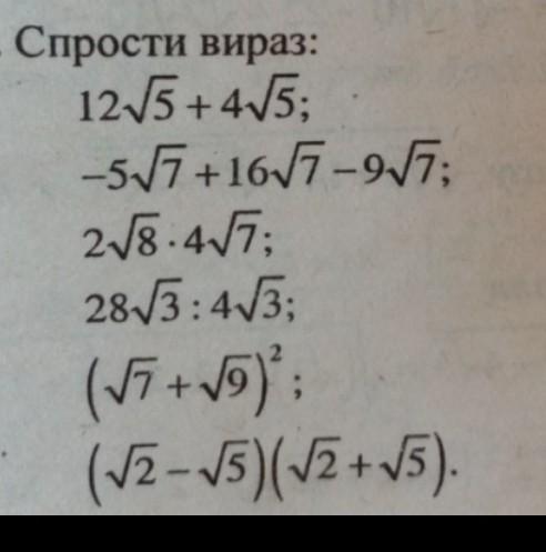 1)12 \sqrt{5}  + 4 \sqrt{5}  = 16 \sqrt{5}  \\ 2) - 5 \sqrt{7}   + 16 \sqrt{7}  - 9 \sqrt{7}  = 2 \sqrt{7} \\ 3)2 \sqrt{8}  \times 4 \sqrt{7}  = 8 \sqrt{8 \times 7}  = 8 \sqrt{56}  = 8 \sqrt{4 \times 14}  = 16 \sqrt{14 }  \\ 4)28 \sqrt{3}  \div 4 \sqrt{3}  = 21 \\ 5)( \sqrt{7}  +  \sqrt{9} )^{2}  = 7 + 2 \sqrt{7 \times 9}  + 9 = 16 + 6 \sqrt{7}  \\ 6)( \sqrt{2}  -  \sqrt{5} )( \sqrt{2}  +  \sqrt{5} ) = 2 - 5 =  - 3