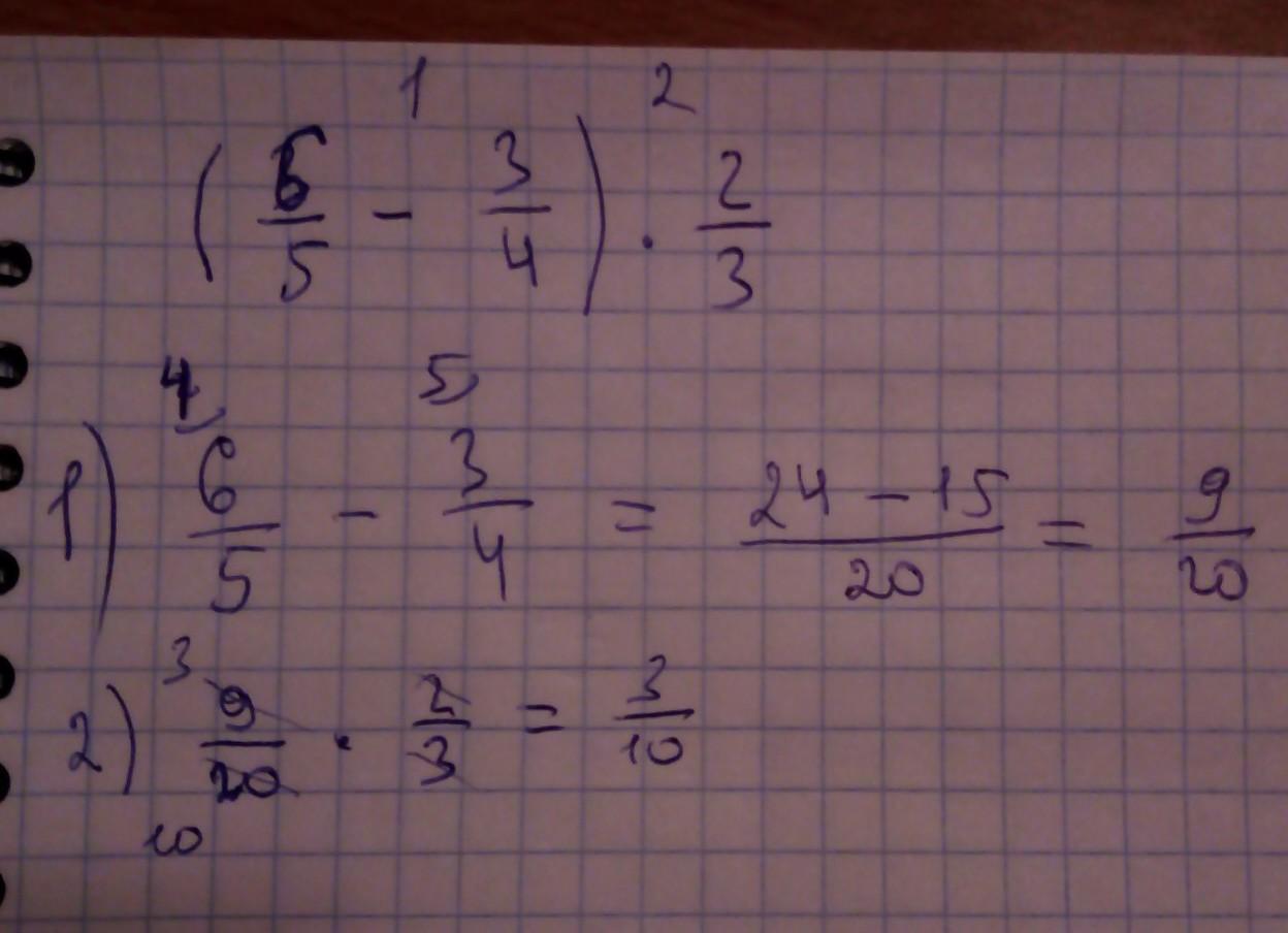 (6/5 - 3/4) * 2/3 = (24/20 - 15/20) * 2/3 = 9/20 * 2/3 = 3/10