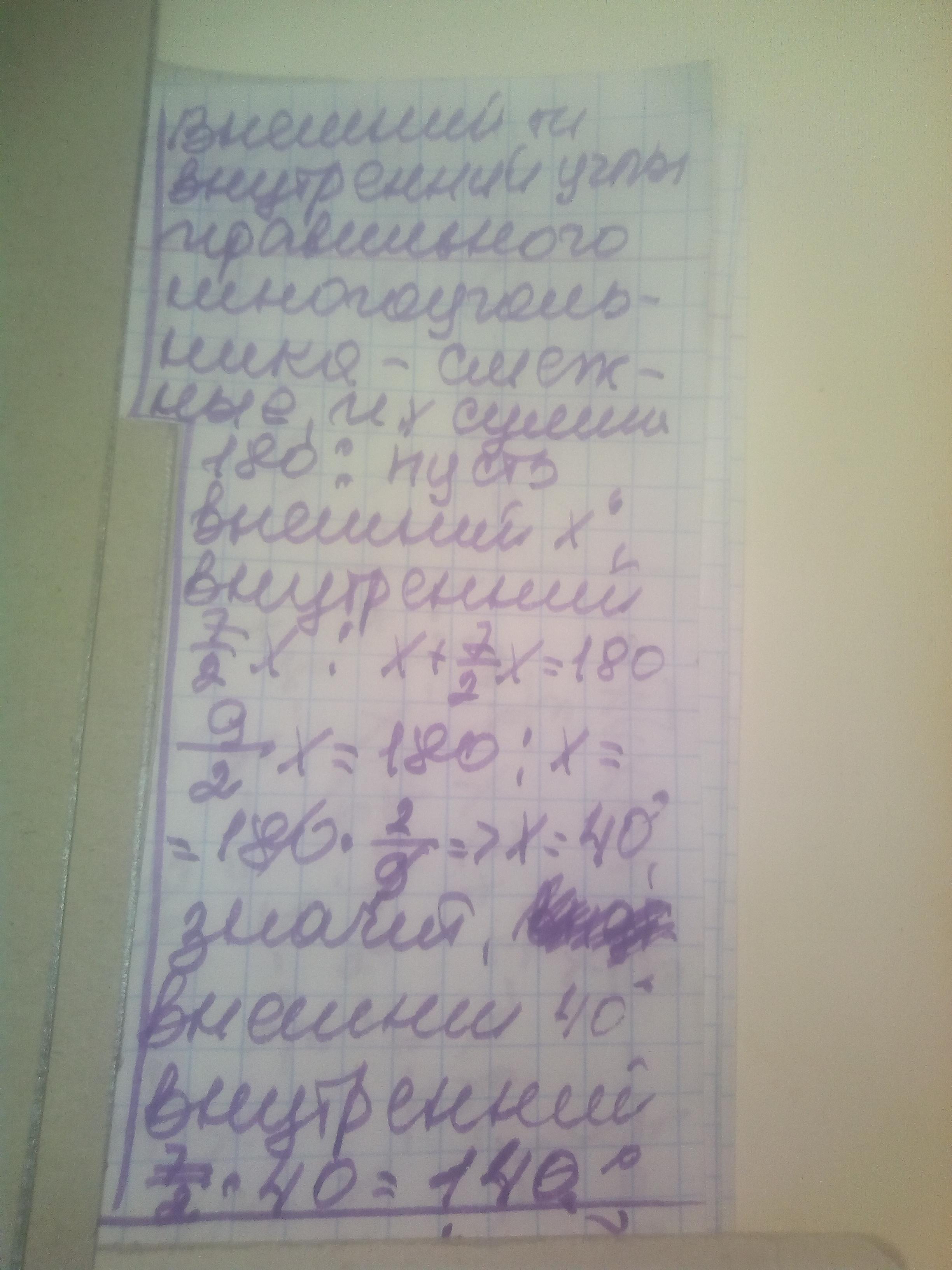 Внутрішній кут правильного многокутника становить 7/2 від зовнішнього кута. Скільки сторін у цього кута?