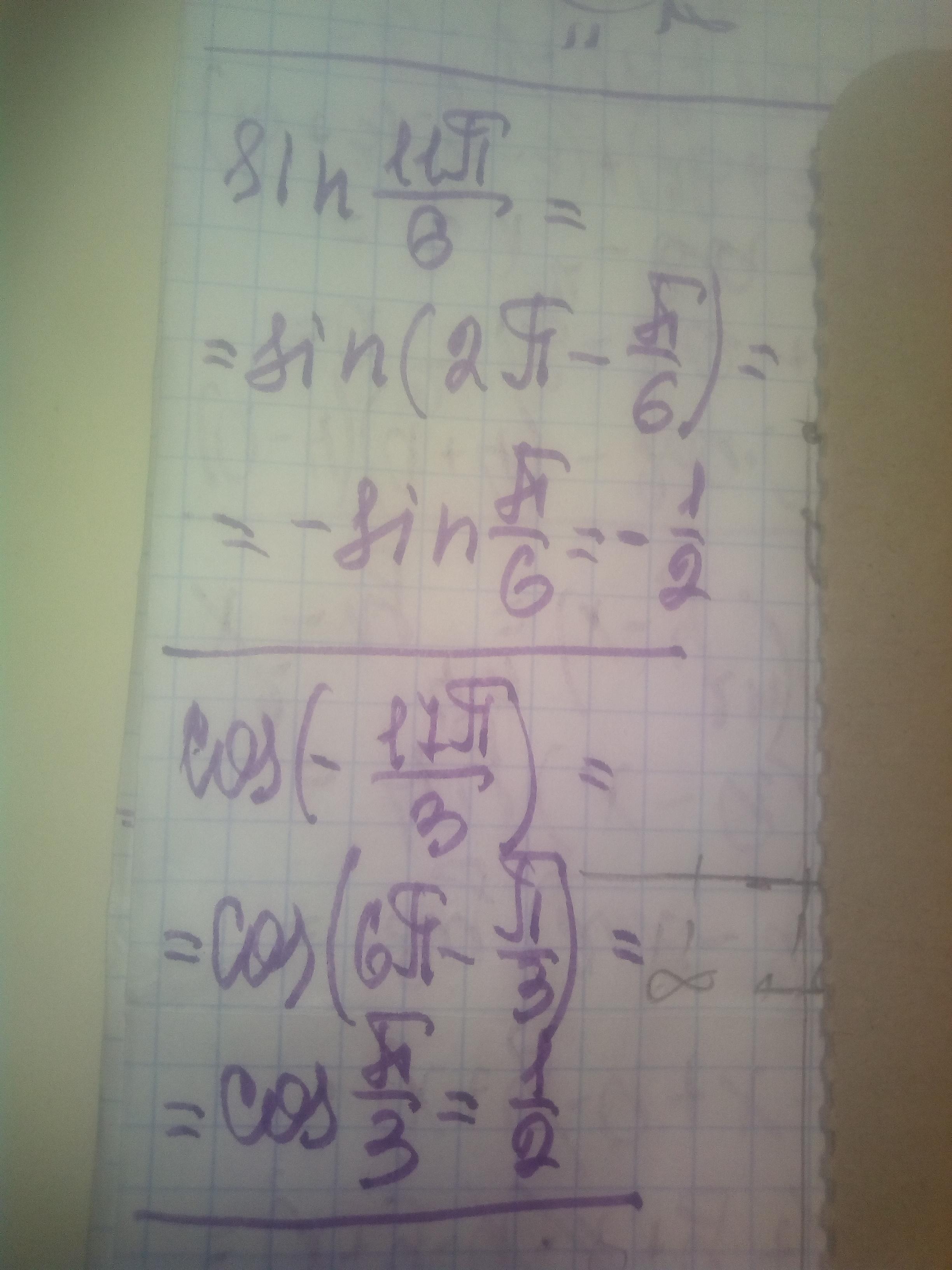5. sin (11π/6) = sin (1 5/6•π) = sin (2π - π/6) = sin (-π/6) = - sin π/6 = - 1/2;