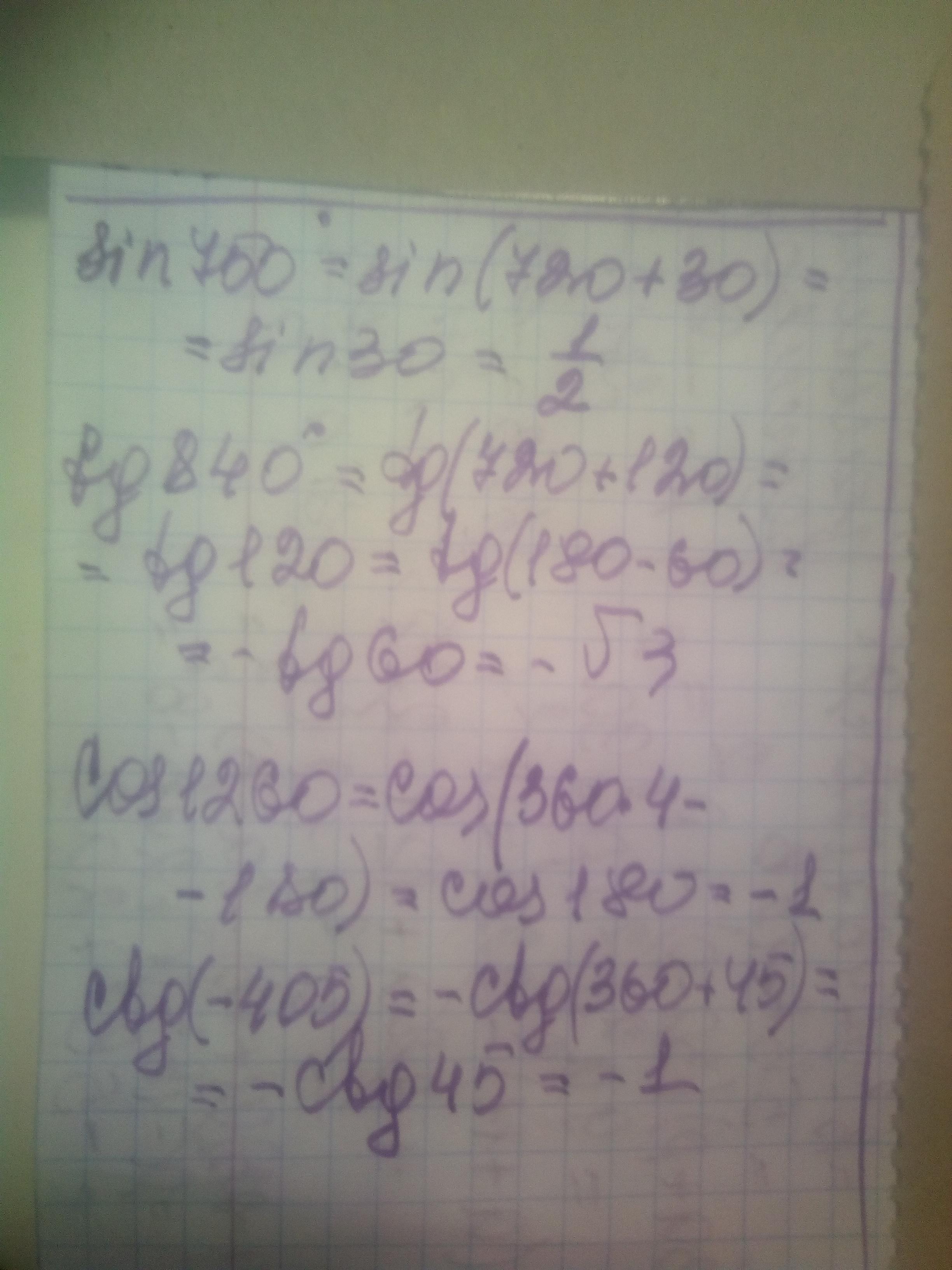 2. tg 840° = tg (180°•5 - 60°) = tg ( - 60°) = - tg 60° = - √3;