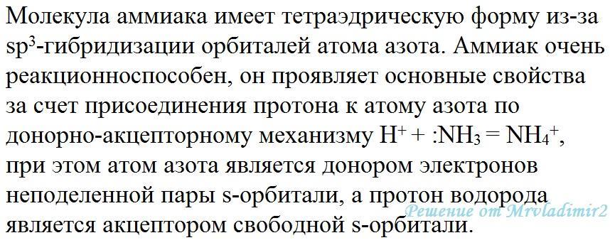 Молекула аммиака имеет тратраэдрическую форму из-за sp3 гибридизации орюбиталей атома азота. Аммиак очень реакционноспособен. он проявляет основные свойства за счет присоединения протона к атома азота по донорно-акцепторному механизму