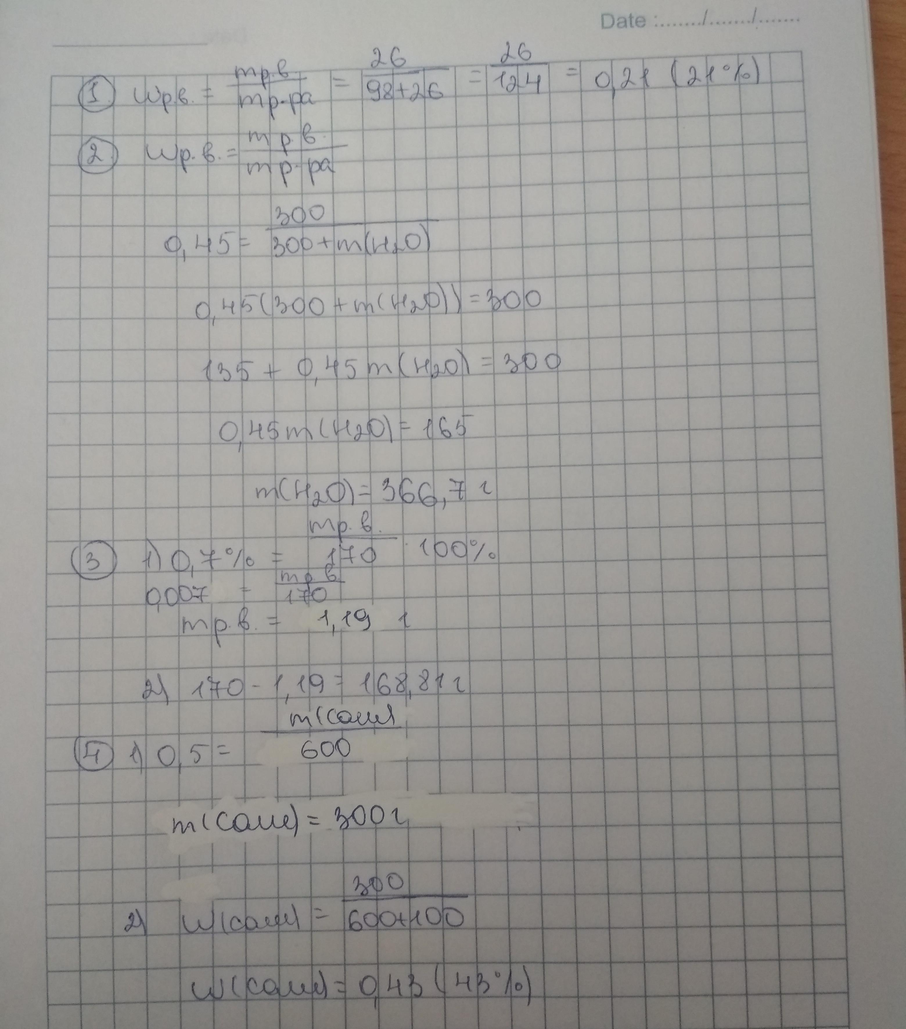 1. Вычислите массовую долю растворенного вещества в растворе, полученном при растворении 26 г соли в 98 г воды. 2. Рассчитайте, какую массу воды необходимо взять для приготовления раствора с массовой долей вещества 45%, если нужно растворить 300г соли. 3. Рассчитайте, какую массу воды и соли необходимо взять для приготовления 170 г раствора с массовой долей соли 0,7% 4. К 600 г 50% р-ра соли добавили 100 г воды. Чему равна массовая доля соли в полученном растворе?