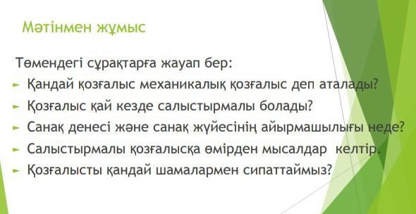 1.Механикалық қозғалыс- дегеніміз уақыт өтуіне қарай дененің немесе оның кейбір бөліктерінің санақ денесі деп аталатын басқа денелерге қатысты кеңістіктегі орын ауыстыруы.