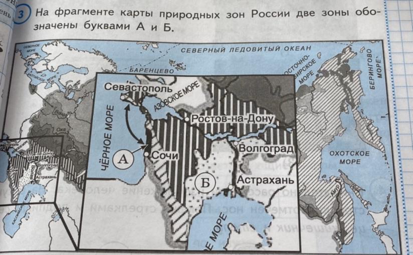 На фрагменте карты буквой А обозначена зона субтропиков, которая расположена узкой полосой вдоль побережья Чёрного моря, а букой Б обозначена зона пустынь и полупустынь, которая простирается в районе Прикаспийской низменности.