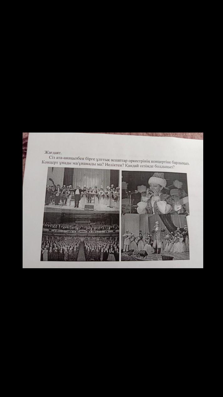 Мен бүгін отбасымызбен оркестор концертіне бардым.Мен үшін концерт ұнады. Мен концертті көріп қатты қызықтым, және менде оркестр өнеріне деген ыстық сезім пайда болды