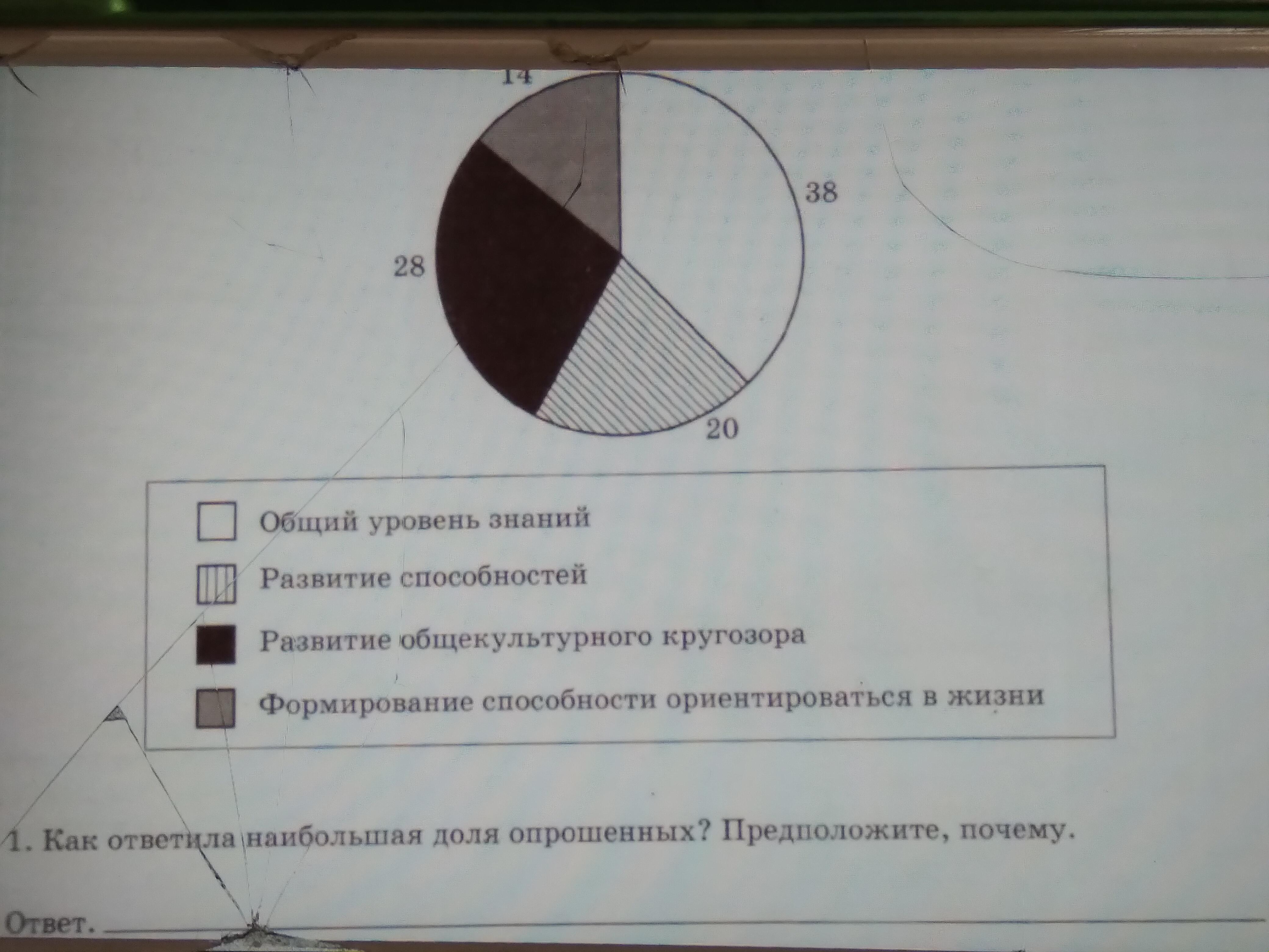 В одном из регионов страны К.в ходе социологического опроса выпускники школы отвечали на вопросв, какой результат своего обучения они считают главным. Результат опроса(в % от числа отвечавших) представлены в графическом виде.Как ответила найбольшая доля опрошеных ? Предположите,почему.