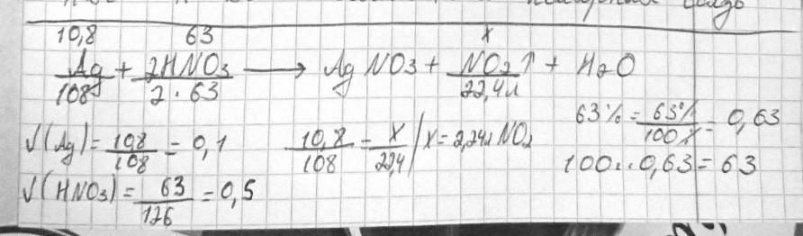 Вычислите объём бурого газа, который образуется при взаимодействии серебра массой 10,8 г. с раствором концентрированной азотной кислоты массой 100г с массовой долей кислоты 63% при нормальных условиях .